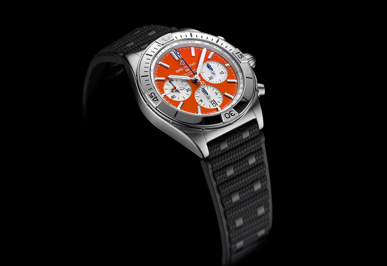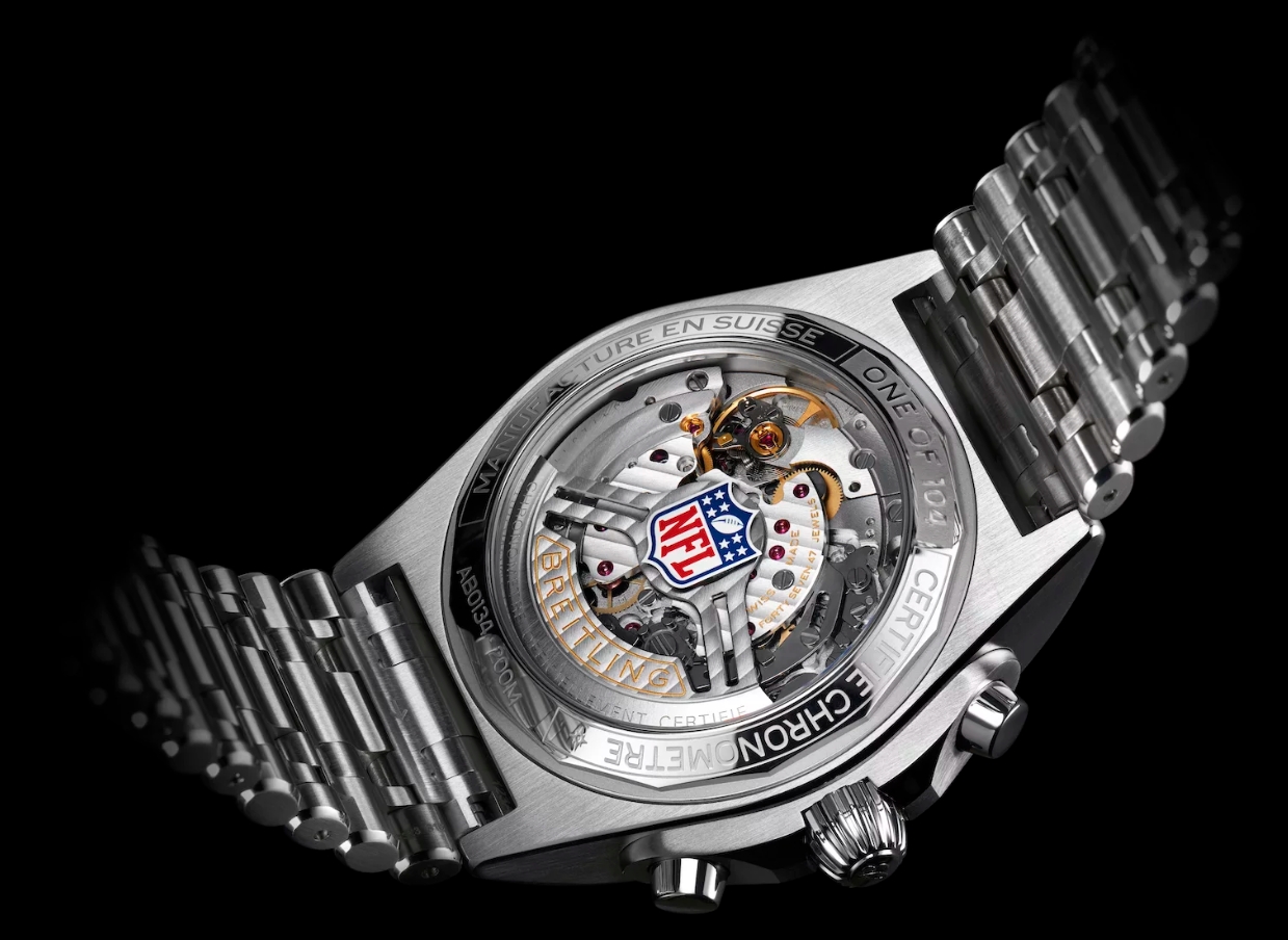 Framing the B01 manufacture calibre exhibited within, you’ll notice the outer border includes the engraving “ONE OF 104” to commemorate the aforementioned anniversary. The NFL logo is tastefully etched on the sapphire crystal’s surface in a manner that does not obscure your view of the 70-hour automatic movement within. The vertical-clutch column-wheel chronograph calibre is also notably COSC-certified and is therefore pledged to run within +6/-4 seconds per day.